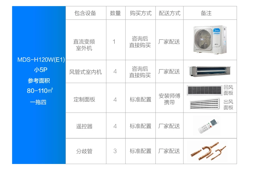 室外機(jī)安裝說明書*1、室外機(jī)使用說明書*1、室內(nèi)機(jī)使用說明書*1、美的家庭中央空調(diào)安裝竣工報告書*1、出水管接管*1、網(wǎng)絡(luò)匹配線組*2、用戶服務(wù)指南*1、連接管(適用于16KW機(jī)型)、L型管(適用于10~14KW機(jī)型) |
